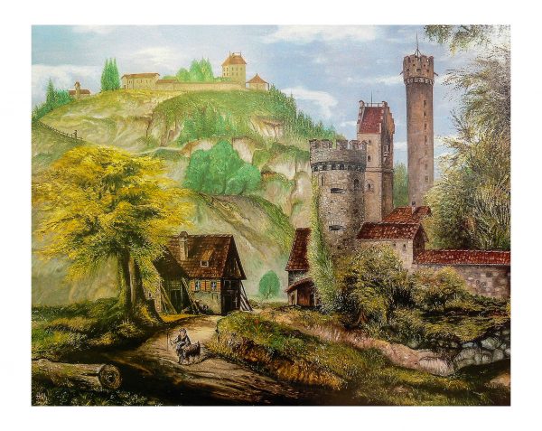 Das Motiv:Die Szene zeigt eine idyllische mittelalterliche Ansicht von Ravensburg mit seinen Wahrzeichen wie dem Mehlsack und der Veitsburg, die auf dem Hügel thront. Im Vordergrund belebt eine ländliche Szene mit einer Person und einer Ziege das Bild und verleiht ihm einen Hauch von Nostalgie. Die warmen Farben und die meisterhafte Komposition machen diesen Druck zu einem echten Blickfang.